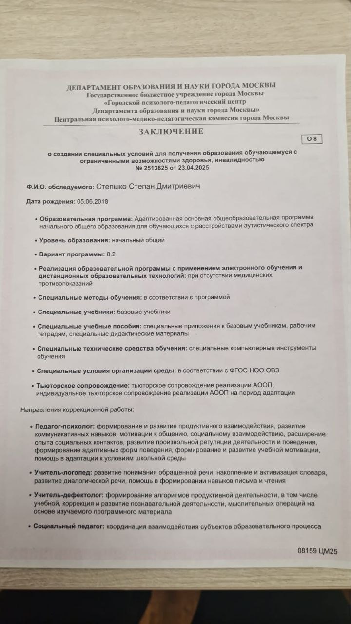 Для начала реализации специальных условий обучения необходимо предоставить заключение ЦПМПК и написать заявление от имени законных представителей.